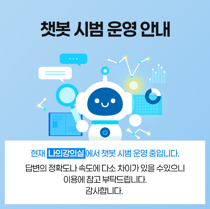 현재 [수강생 계정 접속 - 나의강의실]에서 챗봇 시범 운영 중입니다.